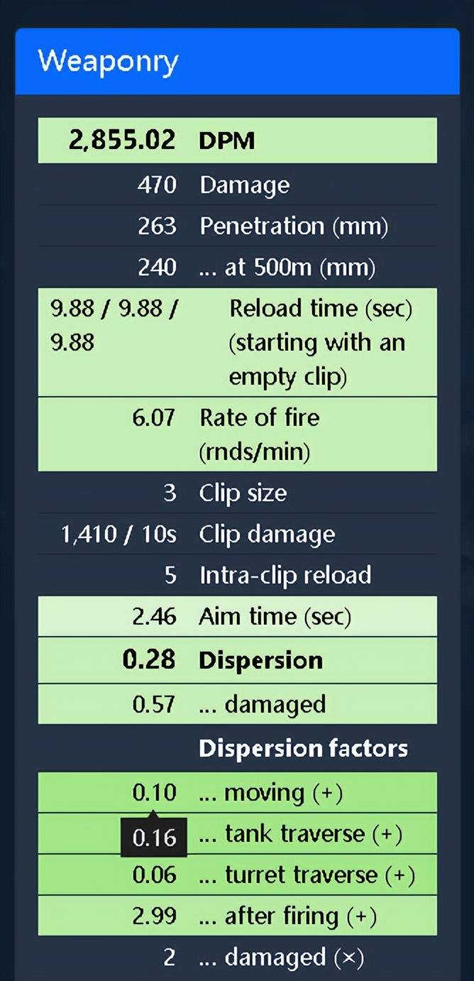 而且拥有高射速的同时,战鳄的标伤居然还高达470,仅比犀牛少20点,并位居十级中坦第一。再结合它优秀的恒定弹鼓机制和5秒的短装填,战鳄既可以选择10秒内打出1410的伤害,也可以利用470的高单发和近3000的DPM进行相持作战。
